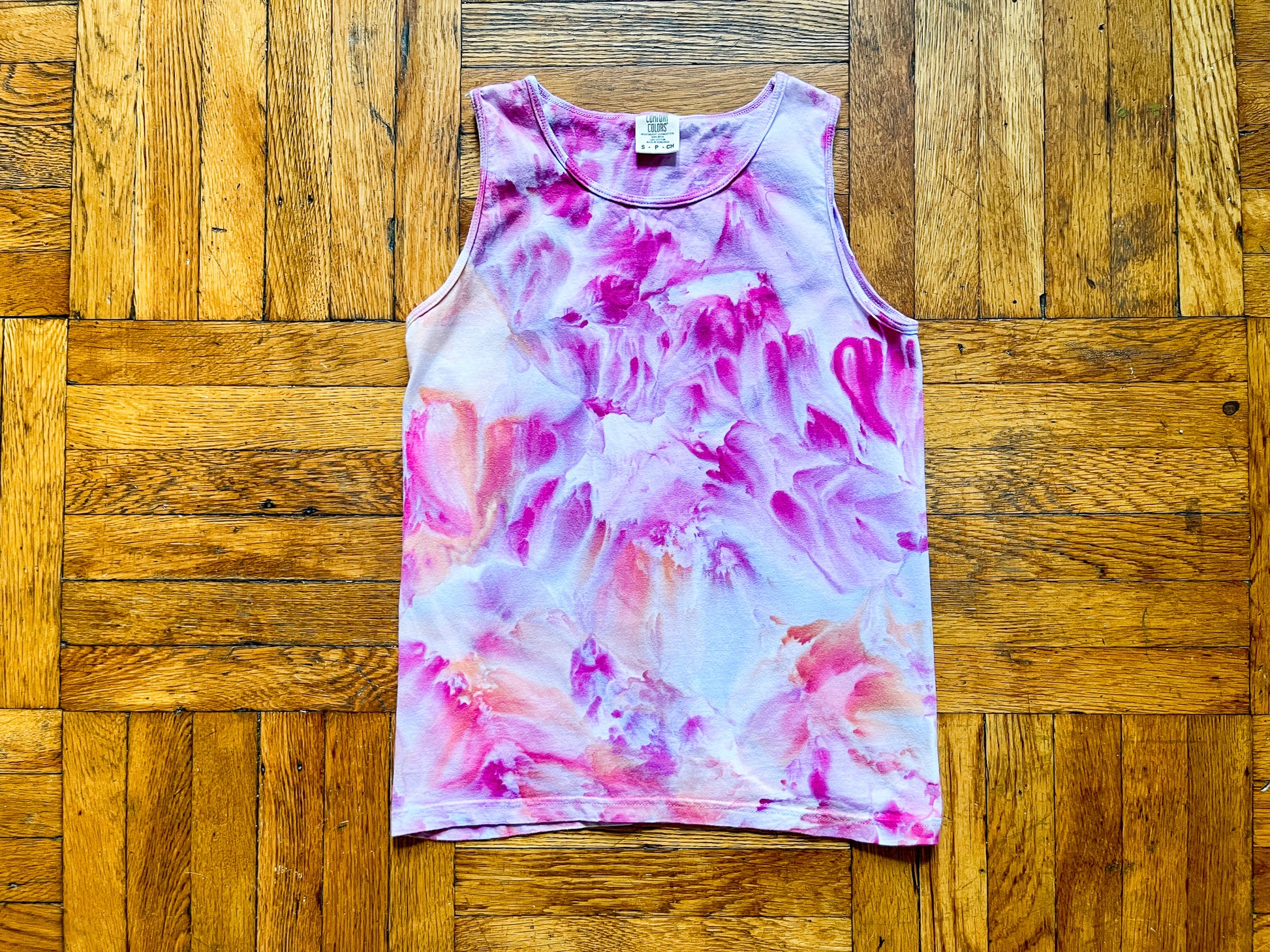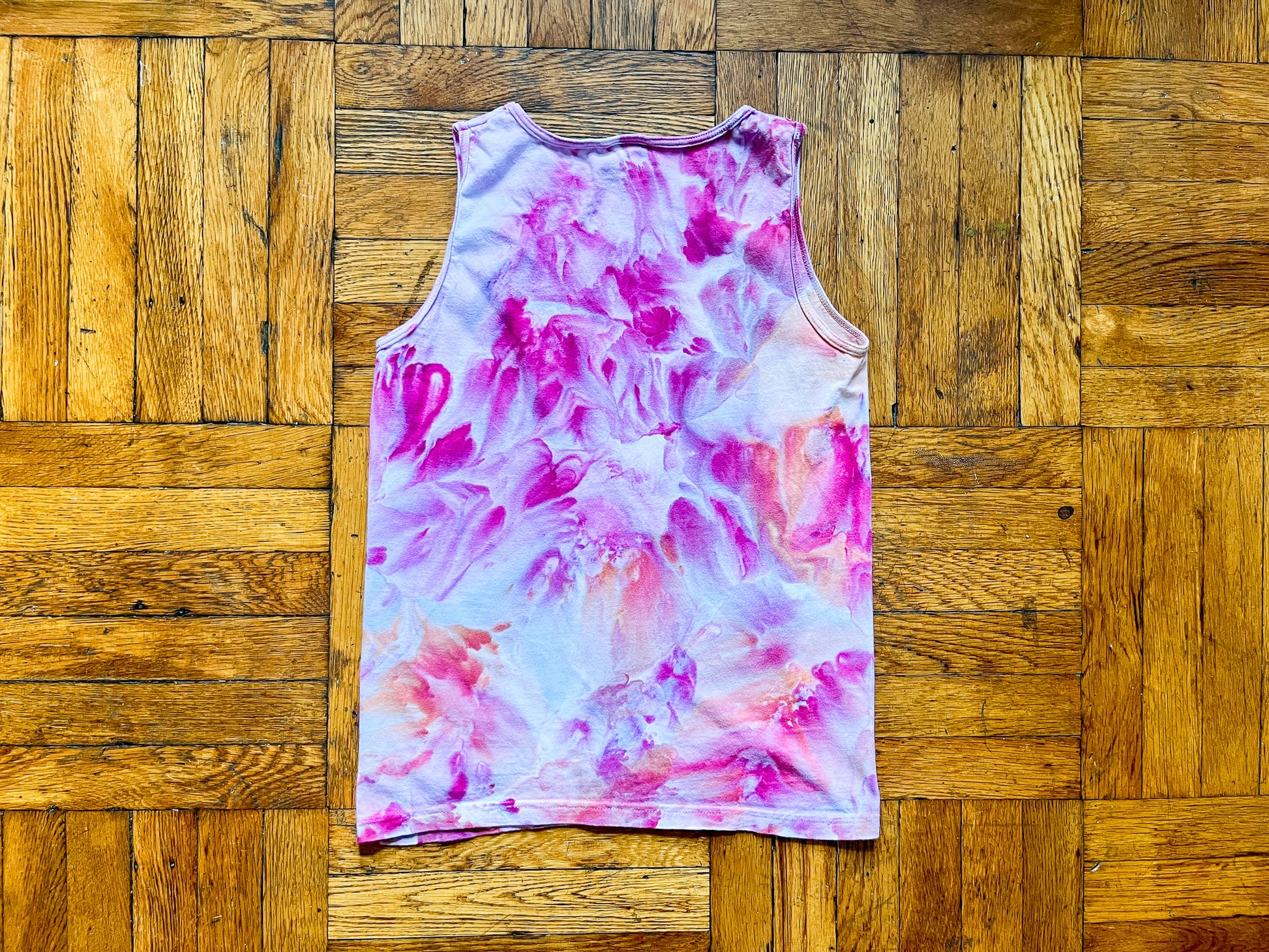 A cheerful tank top boasting a playful mix of pinks and pastel blues and plenty of whimsy.