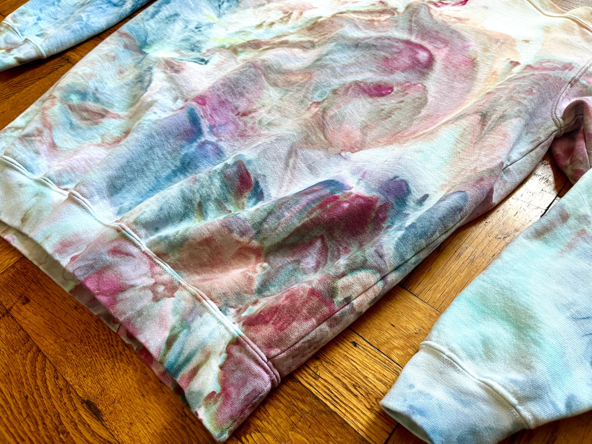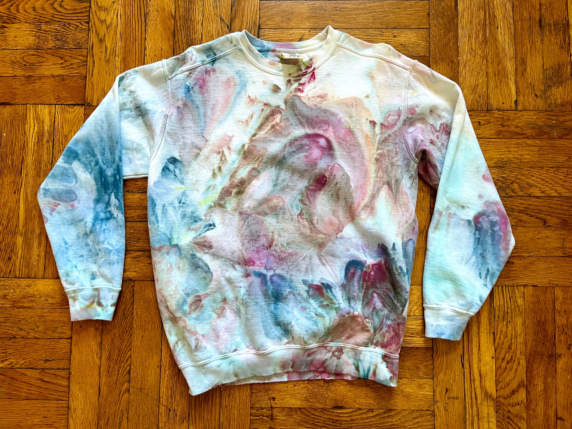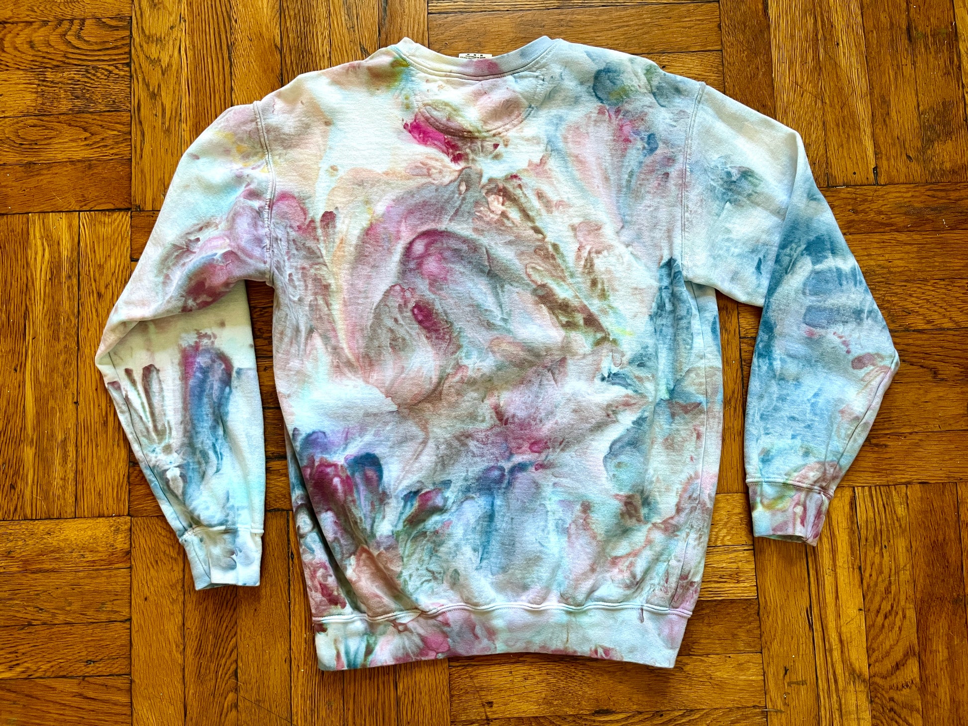 This crewneck looks like a dreamy geode cracked open, swirling with soft bursts of amethyst purples, aqua blues, and earthy greens.