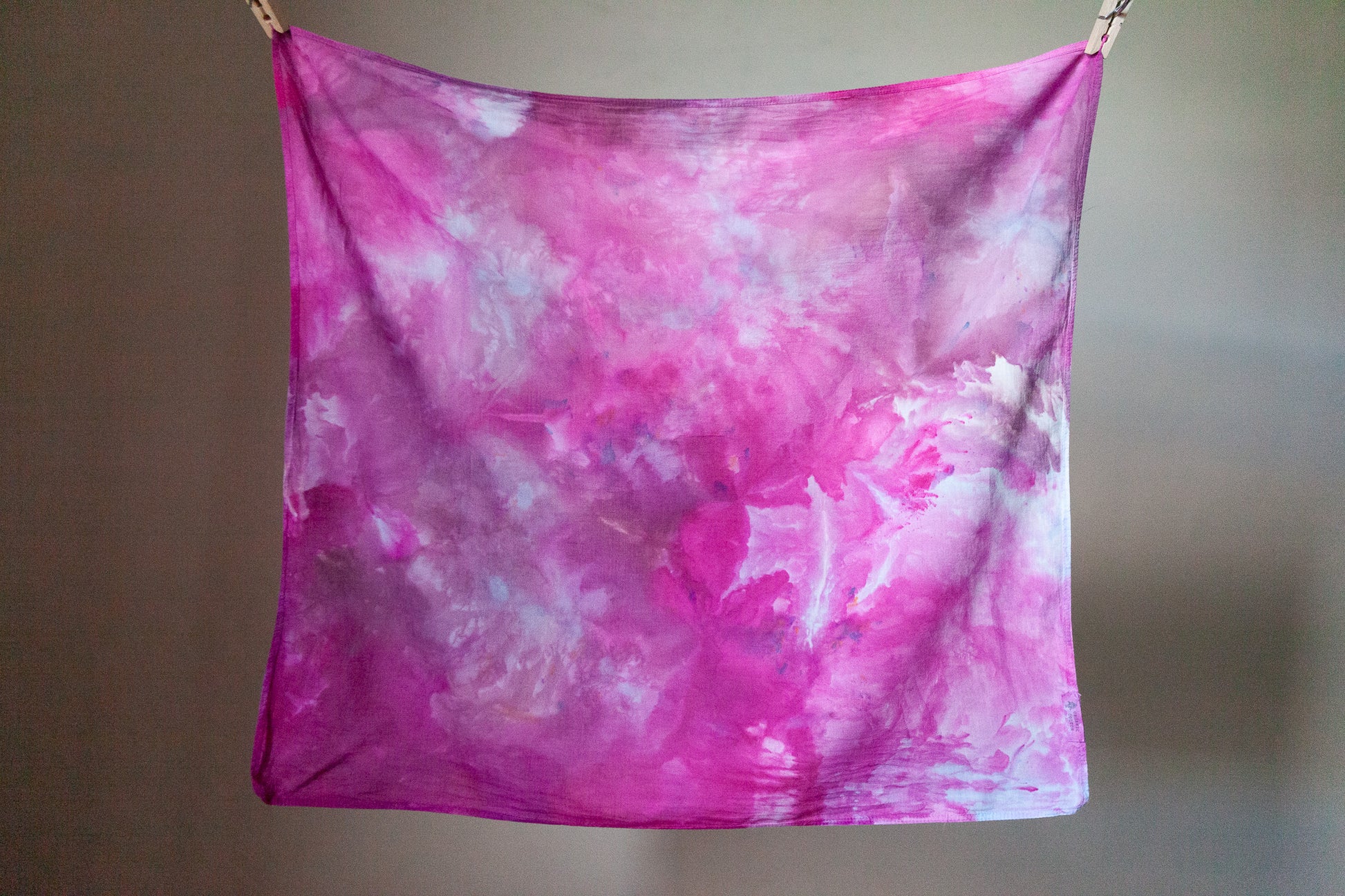 Hand dyed on organic, lightweight cotton. Approximately 24' square.